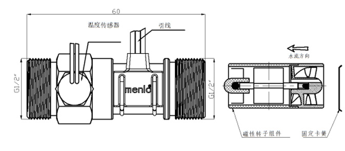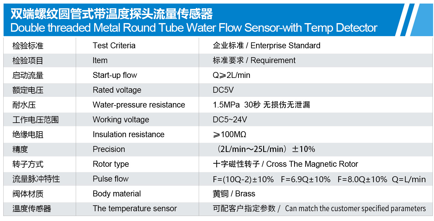 Double threaded Metal Round Tube Water Flow Sensor-with Temp Detector
